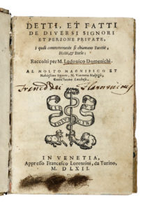 DOMENICHI Lodovico, Detti et fatti de diversi signori et persone private. In Venetia : appresso Francesco Lorenzini, 1562. In-8° (mm 140x100).