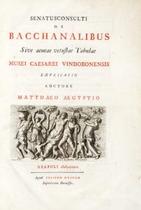 EGIZIO Matteo, Senatusconsulti de bacchanalibus sive aeneae vetustae Tabulae Musei Caesarei Vindobonensis... Neapoli : apud Felicem Muscam, 1729. Neapoli : apud Felicem Muscam, 1729. In folio (mm 315x213).