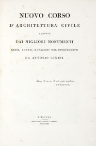GINESI Antonio, Nuovo corso di architettura civile dedotta dai migliori monumenti greci, latini e italiani nel Cinquecento. Firenze : presso Pietro Allegrini e compagni, 1813. In folio (mm 375x260).