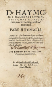 HAIMO Halberstadensis, Homiliarum, nunc tertio diligentissimè excusarum pars hyemalis... S.l. [i.e. Köln] : ex officina Eucharij Ceruicorni, 1534 mense Martio. In-8° (mm 156x100).