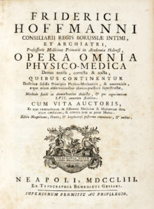 I OPERA: «Hoffmann of Halle was the most important of the Iatromechanists. He believed an ether-like "vital fluid" to be present in the nervous system and to act upon the muscles, giving them "tonus"» (Garrison-Morton 72); cfr. Wellcome III, 285.