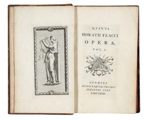 HORATIUS Flaccus Quintus, Opera. Vol. I (-II). Londini : Aeneis tabulis incidit Iohannes Pine, 1733-1737. 2 volumi in-8° (mm 225x131).