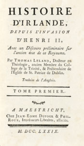 LELAND Thomas, Histoire d'Irlande [...] avec un Discours préliminaire sur l'ancien état de ce royaume. Tome premier (-septieme). A Maestricht : chez Jean-Edme Dufour & Phil. Roux, Imprimeurs-Libraires, associés, 1779. 7 volumi in-12° (mm 162x90).