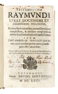 LULL Ramon, Testamentum [...] duobus libris universam artem chymicam complectens. Rothomagi : sumpr. Davidis Berthelin, 1663. 2 parti in 1 volume in-8° (mm 160x100).