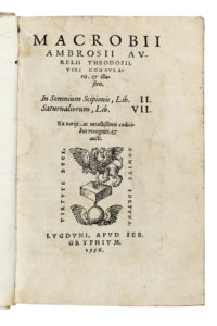 MACROBIUS Ambrosius Aurelius Theodosius, In somnium Scipionis Lib. II e Saturnaliorum Lib. VII. Lugduni : apud Seb. Gryphium, 1556. In-8° (mm 165x100).