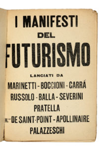 MARINETTI Filippo Tommaso, I manifesti del futurismo. Lanciati da Marinetti-Boccioni-Carrà-Russolo-Balla-Severini-Pratella [...] Prima serie. 1° migliaio. [Firenze : Lacerba, 1914].