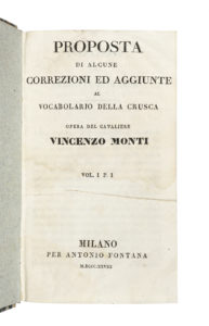 MONTI Vincenzo, Proposta di alcune correzioni ed aggiunte al vocabolario della Crusca... Milano : per Antonio Fontana, 1828-31. 4 volumi in-16° (mm 175x100).