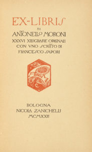 MORONI Antonello, Ex-libris [...] XXXVI xilografie originali con uno scritto di Francesco Sapori. Bologna : Nicola Zanichelli, 1922. In-8° (mm 239x147).