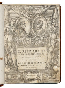 Frontespizio interamente inciso con ritratto di Petrarca e Laura entro ovali.