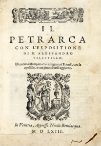 PETRARCA Francesco, Il Petrarca con l'espositione di m. Alessandro Vellutello. In Venetia : appresso Nicolo Bevilacqua, 1563. In-4° (mm 205x145).