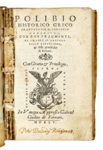 POLYBIUS POLIBIO HISTORICO GRECO TRADOTTO per m. Lodouico Domenichi. Con due fragmenti, ne i quali si ragiona delle republiche, & della grandezza di romani.... In Vinegia : appresso Gabriel Giolito de Ferrari, 1545. In-8° (mm 155x105).