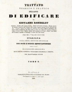 RONDELET Giovanni, Trattato teorico e pratico dell'arte di edificare [...] Prima traduzione italiana sulla sesta edizione originale con note e aggiunte importantissime [...]. Tomo I (-V). Napoli : Stabilimento Tipografico di Francesco Del Vecchio,...