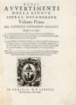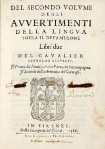 SALVIATI Leonardo, Degli avvertimenti della lingua sopra'l Decamerone... Volume primo (-secondo). In Venezia : [Domenico Guerra & Giovanni Battista Guerra], 1584. In-4° (mm 223x160).