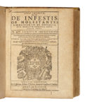 LEGATO CON : Id., Loca infesta, hoc est : de infestis, ob molestantes daemoniorum et defunctorum hominum spiritus, locis, liber unus... Coloniae Agrippinae : ex officina Mater. Cholini, sumptibus Gosuini Cholini, 1598. Pagine [16], 352. Emblema dei Gesuiti in legno sul frontespizio. Forti bruniture, forellini di tarlo e strappetti marginali che non coinvolgono l'inciso. Legatura in piena pergamena con titoli in oro su tassello al dorso ; sguardie rinnovate (mancante il foglio di guardia anteriore). Internamente staccata nella parte anteriore. Note di possesso, alcune delle quali cassate, al frontespizio della prima opera. (1)