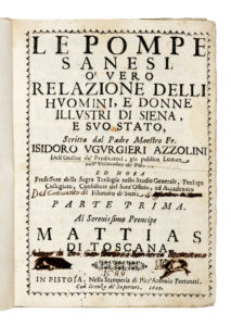 UGURGIERI AZZOLINI Isidoro, Le pompe sanesi, o' vero Relazione delli huomini, e donne illustri di Siena, e suo Stato... parte prima (-seconda). In Pistoia : nella stamperia di Pier'Antonio Fortunati, 1649. 2 volumi in-4° (mm 203x143).