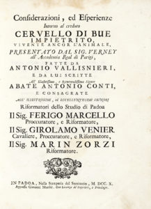 Prima edizione di quest'opera composta dalle Considerazioni, ed esperienze [...] intorno al creduto cervello impietrito e dalle Considerazioni ed esperienze intorno alla generazione dei vermi ordinarj del corpo umano, in cui il Vallisnieri svela, rispettivamente, la vera natura di quello che era stato creduto un cervello impietrito, ritrovato all'interno del cranio di un bue, e dimostra l'erroneità delle teorie riguardanti la generazione spontanea degli insetti. Descrive, inoltre, la tenia del cane e quelle degli uomini. Sabia, 77-78.