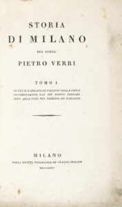 VERRI Pietro, Storia di Milano [...] Tomo I (-II) in cui si narrano le vicende della città incominciando dai piu remoti principi sino alla fine del dominio de' Visconti... Milano : dalla Societa tipografica de' classici italiani, 1834-35.