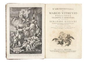 Bella edizione illustrata del Vitruvio, di cui esiste anche una tiratura con diverso frontespizio. Oltre che autore dello stimatissimo volgarizzamento, il Galiani fu anche l'ideatore dell'apparato iconografico: sia l'antiporta che le 25 tavole furono incise su suoi disegni, rispettivamente da Francesco La Marra e da Francesco Cepparuli. Manca a Fowler.