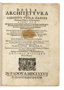 ZANINI Giuseppe Viola, Della architettura [...] libri due ne' quali con nuova simmetria, & facoltà si mostrano le giuste regole dei cinque ordini di detta architettura... In Padova : per Giacomo Cadorino, 1677. 2 parti in 1 volume in-4° (mm232x160).