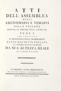 1) Atti dell'assemblea degli arcivescovi e vescovi della Toscana tenuta in Firenze l'anno 1787. Tomo I [-IV]. In Firenze : per Gaetano Cambiagi stampatore granducale, 1787. 4 volumi in-4° (mm 285x205).