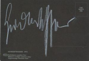 Friedensreich Hundertwasser (1928-2000). Carte postale signée ; 10,5 x 15 cm. Reproduction de sa …