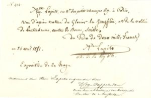 [Juillet 1843], à M. Weenink à La Haye. Il regrette de ne pouvoir laisser sa toile « Vue prise dans les Montagnes de Borghetto, au prix de trois mille francs », car la différence de prix est trop grande… 24 avril 1851. Reçu et lettre, au Secrétaire de la Commission de l’Exposition des Beaux-Arts de La Haye, pour la vente et l’expédition de deux tableaux de paysages : « Vue d’après nature du glacier de la Jungfrau, et de la vallée de Lauterbrunn, canton de Berne, Suisse, au prix de deux mille francs » ; et « Le Matin, vue prise dans les Montagnes de La Spezia, Piémont », à 4000 francs ; « pour votre exposition des Beaux-Arts…