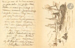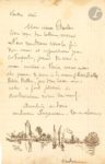 Il est à Honfleur : « Je fais force croquis et pochades, très beau pays, le port très intéressant » ; il essaiera d’en tirer parti pour des tableaux ; sur la 3e page, dessin à la plume : vue du port. – Vendredi soir. Il rentre à la fin du mois mais repartira pour le Tréport ; au bas de la lettre, dessin à la plume : vue d’un port « Oustram » (Ouistreham ?).