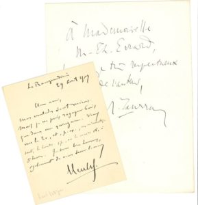 Juliette Adam (à P. de Nolhac), René Bazin, Maurice Bedel, René Doumic, Paul et Germaine Fort, Gabriel Hanotaux, Pierre Loti, Paul et Victor Margueritte , Charles Maurras, Pierre de Nolhac, Paul Souday. Plus 6 cartes de visite autogr.