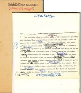 La couverture, avec le titre, porte la mention : « (à trier et à corriger) ». Ce dossier rassemble des séries de textes de types divers. – Méditation 1 à 4 collées au dos de papier à en-tête du Service médical de L’Union Vie, avec d’importantes corrections autographes. – 3 manuscrits autographes : « Le baiser est une création tardive »… ; « L’homme a inventé les cercles et les ballons »… ; « Le besoin de boissons fortes doit être provoqué par le sentiment océanique »… (ce dernier très corrigé, avec un début de mise au net). – 6 textes dactylographiés découpés et contrecollés avec nombreuses corrections autographes, puis biffés au crayon rouge : La bataille, Le défilé, Au bal, Le carrefour, La ville de pierre, Le cirque. – Une suite de texte en double carbone (dont les six précédents dans leur première version), avec de très rares corrections ; au milieu, 4 ff. sont dactylographiés au dos de 2 circulaires de L’Ami des bêtes, et 2 prières d’insérer. – Une série de 27 textes dactylographiés en bleu puis en noir, corrigés à l’encre noire ou rouge, chacun marqués ensuite OK en marge. – 6 textes d’une frappe postérieure, dont un (Pour avoir été Roxane) très corrigé. – La dernière section est intitulée Le bestiaire (titre autographe) et comprend 33 textes dactylographiés et corrigés à l’encre noire, et 3 textes autographes (le lion, le chien, le chat). Plus 2 feuillets autographes (4 p.), liste de noms à l’encre noire biffés ou encadrés en rouge (Eva d’Oncques, Zéphirine Barbot, etc.) ; et la photocopie d’un autre tapuscrit corrigé de Méditations en vrac (78 p.).