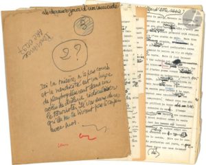 On joint 2 tapuscrits avec corrections autographes, Les derniers jours d’un suicidé ; 54 pages in-4 sous dossier cartonné (annoté : « Brouillon partiel du Puzzle »), et environ 59 feuillets in-4. Deux versions successives de ce court roman inédit. Plus un tapuscrit intitulé sur la couverture Brouillon partiel du Puzzle (164 p.).