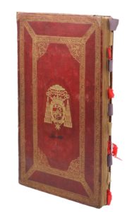 1679. In-folio, maroquin rouge, double encadrement de roulettes dorées se rejoignant aux angles, gerbes de fleurons aux écoinçons, armoiries au centre, dos orné aux petits fers, roulette sur les coupes, tranches dorées, onglets de soie multicolore (Reliure de l'époque).Somptueux antiphonaire romain imprimé en rouge et noir avec la musique notée.