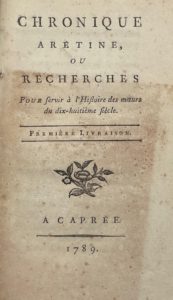[CURIOSA] — Chronique arétine, ou Recherches pour servir à l'histoire des mœurs du dix-huitième siècle. Première livraison. À Caprée [Paris], s.n.,