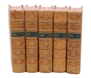 1764-1771. 5 volumes in-4, basane porphyre, double filet doré, dos orné, tranches rouges (Reliure de l'époque).Édition originale complète.