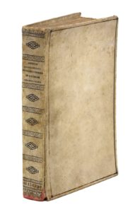 Paris, Thomas Kees pour Denis Roce, 1512. Petit in-4, vélin blanc, filet noir en encadrement, dos lisse orné à froid, tranches lisses (Reliure du XIXe siècle).Première édition parisienne de la grammaire latine d'Antonio de Nebrija.