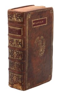 1768. In-12, veau marbré, triple filet doré avec fleurs de lis et lyres dorés aux angles, emblème central composé d'un sceptre et d'une lyre couronnés dans un médaillon de laurier, supralibris de Mme Liège dans un cartouche de maroquin rouge sur le premier plat, dos orné de fleurs de lis et lyres alternées, tranches rouges (Reliure de l'époque).Premier psautier huguenot publié en France depuis la révocation de l'édit de Nantes, édité par Pierre Dangirard (1725-1781), qu'on appelait le « pape » des protestants de La Rochelle, avec la collaboration d'Élisabeth Rondeau, sa femme, pour la musique notée des psaumes et des cantiques.