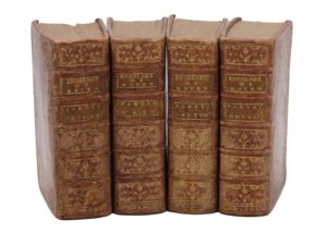 Rouen, François Oursel, 1739. 4 volumes in-12, maroquin rouge, importante dentelle aux petits fers dorés, dos orné, dentelle intérieure, tranches dorées (Reliure de l'époque).Exemplaire complet des quatre volumes reliés en maroquin rouge à dentelle.