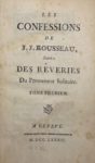 1782. 2 volumes in-8, demi-veau marbré, dos lisse orné, tranches marbrées (Reliure de l'époque).Édition originale des six premiers livres des Confessions et des Rêveries du promeneur solitaire. Les livres VII à XII des Confessions ne furent publiés qu’en 1789.