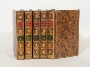 Paris, Didot l'aîné, 1789-1790. 5 volumes in-8, veau marbré, triple filet doré, dos lisse orné de pièces d'armes, tranches jaspées (Reliure de l'époque).Première édition française de cet ouvrage précurseur, traduit par Étienne de Senovert.