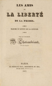 10 pièces in-8 et une pièce in-folio repliée en un volume in-8, demi-cuir de Russie bleu avec petits coins de vélin vert, dos lisse, tranches jonquille (Reliure de l'époque).Ce volume renferme : CHATEAUBRIAND (François-René de). Les Amis de la liberté de la presse. Marche et effets de la censure. Paris, Le Normant, 1827. – [SALVANDY (Narcisse-Achille de)]. Lettre de la Girafe au pacha d'Égypte. – Seconde lettre... Paris, Sautelet, 1827. – Tableau des débats politiques et littéraires, pour le journal libre d'Alexandrie en Afrique. 8 Août 1827. Compilation de 6 pp. d'articles et de passages censurés du Courrier français, du Constitutionnel, du Journal des Débats, etc. – Lettres des sociétaires prétendus révoltés du Théâtre royal de l'opéra-comique, à Monsieur Guilbert de Pixérécourt. Paris, Fournier, 1827. – HYDE DE NEUVILLE (Jean-Guillaume). Des inconséquences ministérielles, ou Lettre d'un député... Paris, Le Normant, 1827. – SALVANDY. Lettre à M. le recteur du Journal des débats sur l'état des affaires publiques. [Seconde lettre, Troisième lettre, Quatrième lettre]. Paris, Sautelet, 1827. – SALVANDY. Explication de la nouvelle loi sur les collèges électoraux et les jurys. Paris, Le Normand, s.d.
