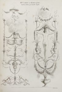 Ce recueil contient 40 belles planches d'éléments de décoration intérieure gravées à l'eau-forte et à l'aquatinte par Guyot d'après les dessins réalisés à Rome par Lavallée-Poussin, mais aussi par Voisin, Leclère, Berthelot, Janneret et d'autres. Ces planches sont précédées de leur explication et d'une notice historique sur le « genre arabesque » dues à Alexandre Lenoir, le fondateur du musée des Monuments français.