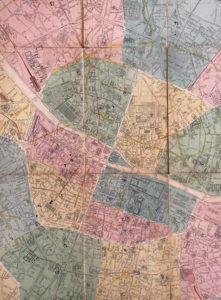 1839. Échelle 1:6666e. Plan gravé sur métal et rehaussé de couleurs, en deux feuilles divisées en 32 sections, entoilé au verso (97,5 x 135 cm). Important plan de Paris mettant en évidence le réseau de conduites d'eau issues du canal de l'Ourcq par un système de rehauts de couleurs manuscrits, mais aussi les fontaines publiques, robinets de décharge et poteaux d'arrosement.