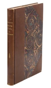 Paris, Jules Le Petit, 1877. In-8, bradel demi-maroquin brun avec coins, dos lisse orné d’un fleuron doré, tête dorée, non rogné, couverture (Carayon). La bibliothèque d’Emmanuel Martin (1821-1882), riche en livres à figures, fut dispersée du 5 au 10 février 1877. Le catalogue décrit 823 ouvrages.