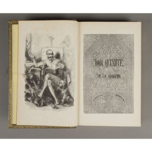 Nombreuses illustrations de Tony Johannot gravées sur bois, comprenant 3 frontispices dont le portrait de Don Quichotte avec moustache, 3 pages de titre gravées, 7 planches hors texte et près de 800 grandes vignettes in-texte.