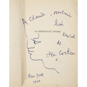 Envoi a. s. de Cocteau, avec croquis, à Claude Hersaint, important collectionneur de surréalisme : "à Claude, souvenir bien amical de Jean Cocteau New-York 1949".