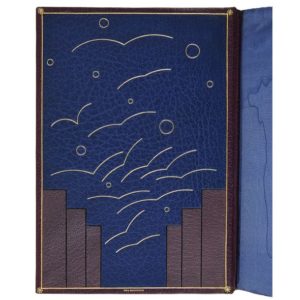 In-8, maroquin bordeaux, filets et roulette dorés en encadrement, dos à nerfs orné de même, doublures de maroquin bleu ornées de motifs architecturaux rectangulaires gris et oiseaux et cercles stylisés dorés gardes de moire bleue, doubles gardes de papier marbré, tête dorée, couv. et dos cons., étui bordé (Ripa Sergounine).