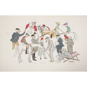 Album de 21 caricatures en couleurs par Hassan de Guiroye, représentant divers membres de la haute société française en poste à Byzance : ministres, membres de l'ambassade, dignitaires ottomans, intellectuels, sportifs…