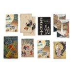 - 8 menus de la NYK Line (Nippon Yusen Kaisha Line), 1934. Livrets ornés de reproductions en couleurs d'artistes divers : Hiroshige, Hanabusa Iccho, Nikko…