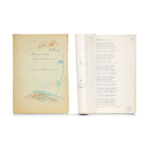 b1- Poème. Tapuscrit 1964-1980 : sur papier pelure, 20 pp. recto (sauf une tapuscrite recto-verso), agrafées, chacune paraphée par l'auteur, réunissant 18 poèmes datés 1964 à 1980 (tapuscrit ou à la main par l'auteur). Cet important ensemble comprend également 12 grands dessins en noir et en couleurs, signés, sur 12 feuilles recto dont 1 formant la couverture. Mentions autographes, datées 1980, sur les 2 derniers dessins.