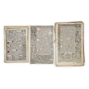 - Fort ensemble de feuillets extraits d'Heures imprimées : ed. : Heures a l'usaige de Romme, Paris, Guillaume Godard, almanach pour 1518-1527. En tout 82 ff., impression sur papier.