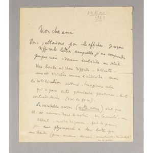" Mon cher ami. Donc attendons pour les affiches. Je reçois différentes lettres auxquelles je ne comprends presque rien - devenu imbécile au soleil. Une bande est chose difficile - délicate - une et indivisible comme l'individu […] Attendez-moi, sans moi les ficelles s'embrouillent. Ces affiches ne sont joyeuses et possibles que si tous se plaisent et il ne faudrait pas que les noms chassent leurs propriétaires. Parlez avec Daudet et les Hugo [Valentine et Jean Hugo] très renseignés et très habiles. Vance sait il la flûte ? Montrez le Cap et votre musique à Valentine Hugo - excellente lectrice. Moi je ne sais pas faire la différence entre un do et un fa mais seulement entre Schmitt et Satie. Votre, JC ".